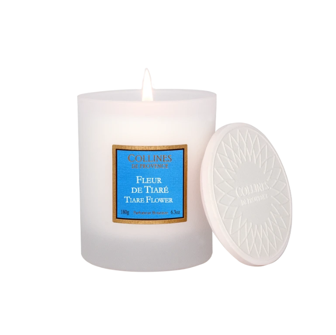 Bougie naturelle à la cire végétale de 180 g à la fleur de Tiaré, fabriquée en France avec des cires de qualité pour une combustion durable et raffinée.